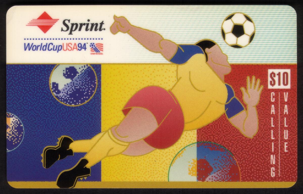 The design includes artistic elements such as drawings or paintings that emphasize the soccer theme. The card is associated with Sprint and is part of a series connected to international soccer, specifically the World Cup event held in 1994. The text on the card includes the words “Romania,” “Soccer,” “World Cup 1994,” and “WITHDRAWN,” providing clear identification of the subject.