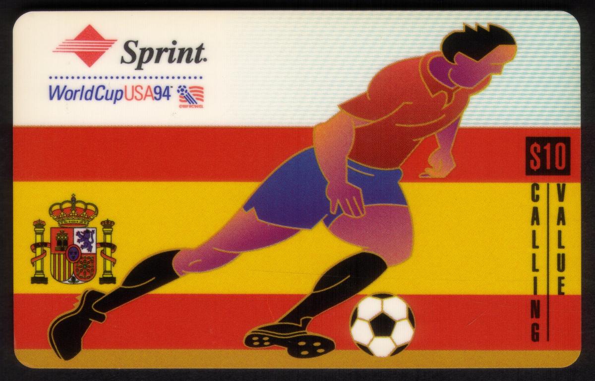 Text on the card clearly indicates "World Cup 1994: Spain" along with the word "WITHDRAWN" and the term "Specimen," suggesting this is a special edition or sample card related to that event. The card is linked to the sport of soccer (also referenced by its alternate names futbol and fotboll). Overall, the card celebrates Spain’s participation in the international soccer competition of 1994 through vivid visual and textual elements.
