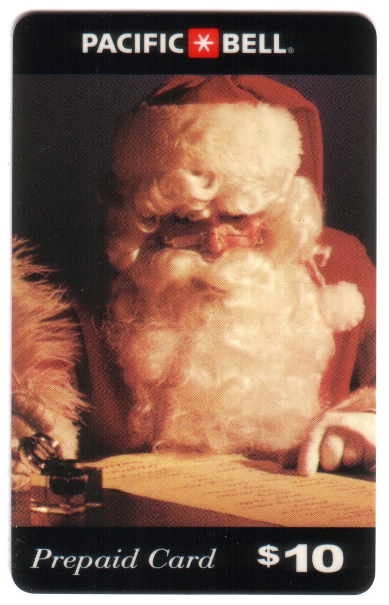 The card includes clear branding with the "Pacific Bell" name displayed, connecting it to the well-known telephone service provider. A denomination of $10 is printed, indicating the card’s value. Additional holiday elements and festive decoration complement Santa’s figure, contributing to the seasonal theme. The design combines traditional Christmas imagery with the functionality of a phone card, making it a collectible item for both phone card enthusiasts and holiday memorabilia collectors.