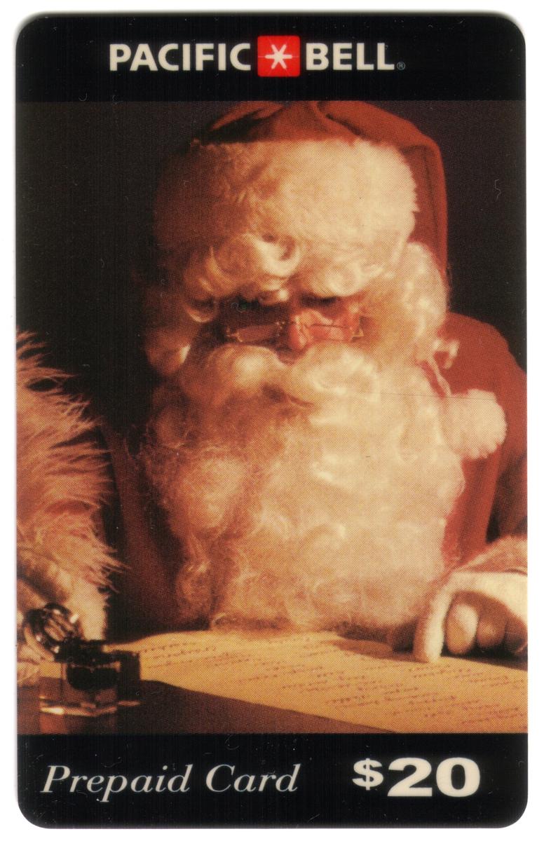 The card's value is clearly marked as $20 in the upper right corner. Additional text includes the issuing company, Pacific Bell, located in the lower right corner, identifying the card’s origin. The overall design is clean and festive, focused entirely on the holiday motif with a clear representation of Santa Claus engaged in reviewing a Christmas list.