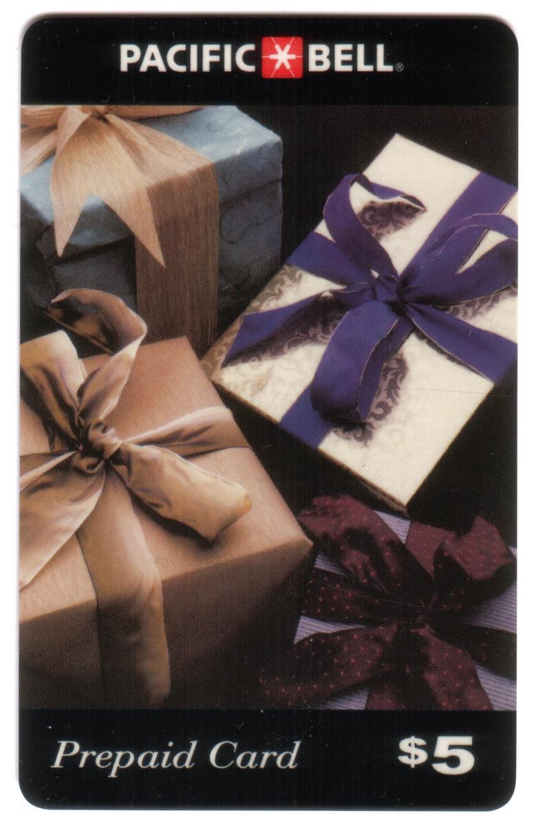 In the upper right corner, the card shows the value "$5" prominently, indicating the card’s prepaid amount. "Pacific Bell" is clearly printed on the card, establishing the telecommunications company issuing this collectible item. The text "1995 Holidays" and "Holiday Presents All Wrapped Up" are also visible, confirming the year and theme of the card. The overall design emphasizes holiday cheer and the excitement of presents during the Christmas season.