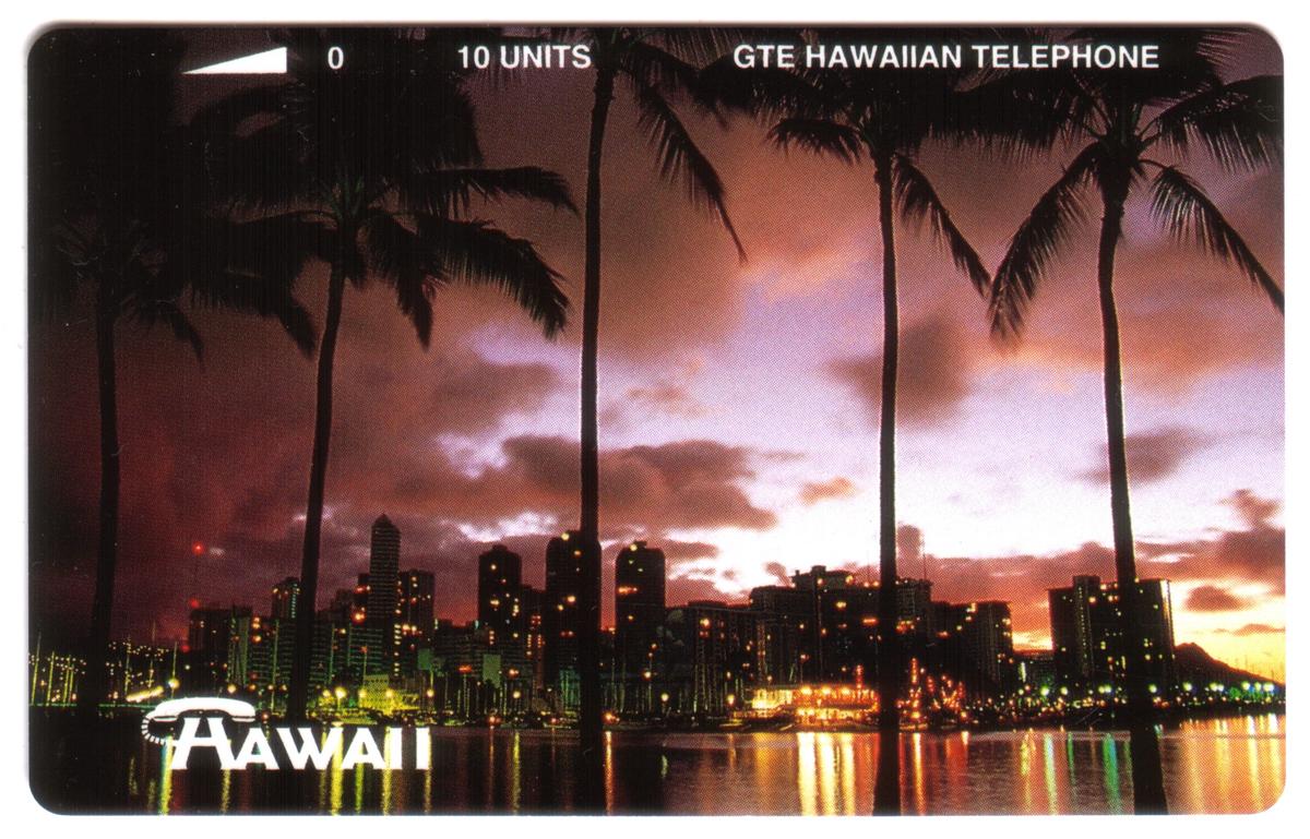 Hawaii twilight scene with Honolulu skyline, palm trees, and ocean reflection; features 10 units for calling within Hawaii, with a gold chip and magnetic strip. |