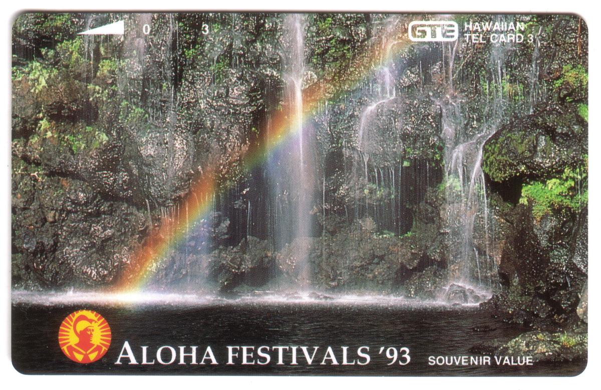 This GTE Hawaiian Telephone collectible card combines imagery related to Hawaii's natural beauty and cultural celebration, making it a unique item for collectors interested in travel, rainbows, waterfalls, and the 1993 Aloha Festivals in Hawaii.