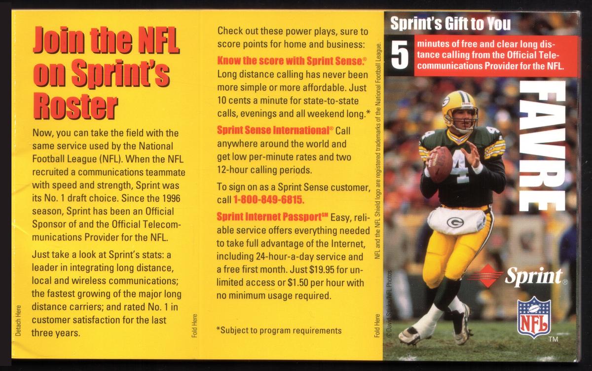 The card includes official NFL and Sprint logos, as well as text reinforcing Sprint’s sponsorship of the NFL since 1996. The layout uses bold yellow and black text on the left and center panels, contrasted with the full-color photo of Favre on the right panel. The overall design promotes both Brett Favre as a football legend and Sprint as a trusted partner in NFL communications.