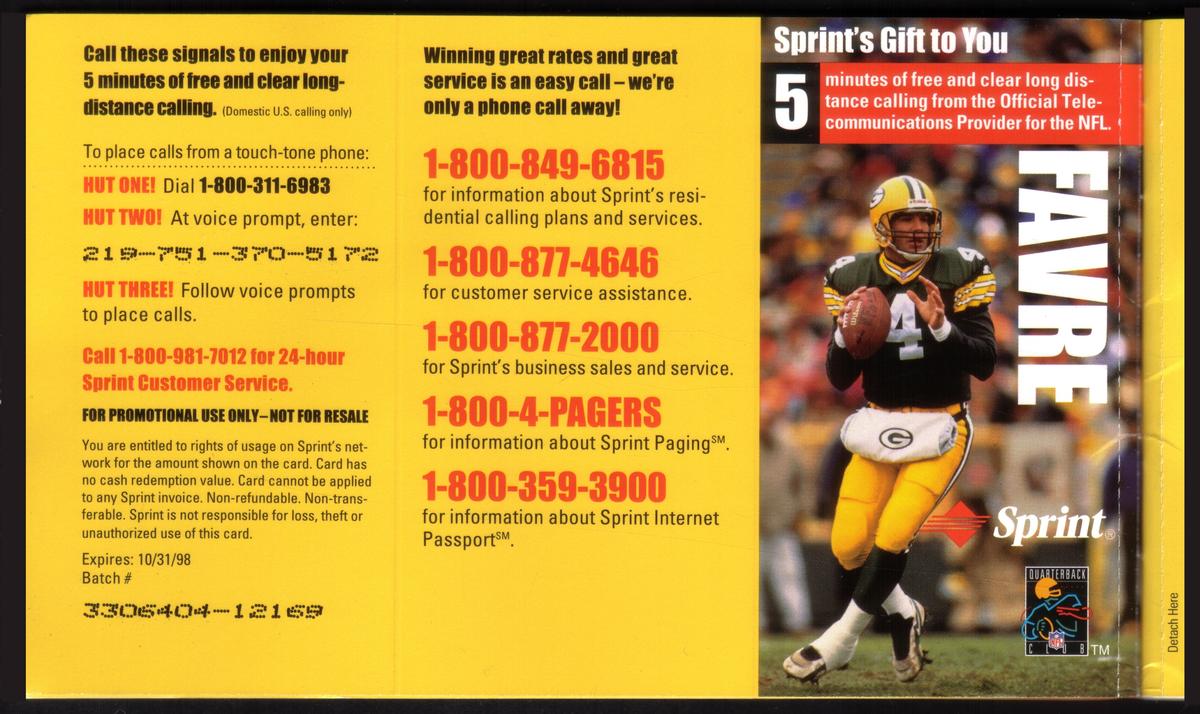 This collectible paper card celebrates NFL quarterback Brett Favre of the Green Bay Packers and references Sprint's sponsorship relationship with the National Football League. The card features a full-color action photograph of Brett Favre in his Packers uniform, running with a football under his right arm and preparing to throw with his left hand. Favre is wearing the team's green and gold colors and a helmet with the Packers' iconic "G" logo.