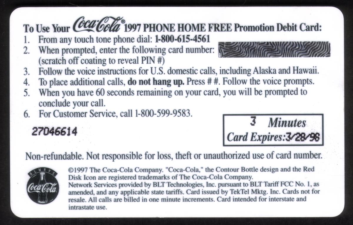 This card is associated with the year 1997 and relates to the "Phone Home Free" campaign by TekTel Marketing Inc., indicated in the keywords. The design strongly reflects Coca-Cola’s traditional branding and advertising style, with a focus on the iconic Coca-Cola bottle in winter conditions surrounded by ice.