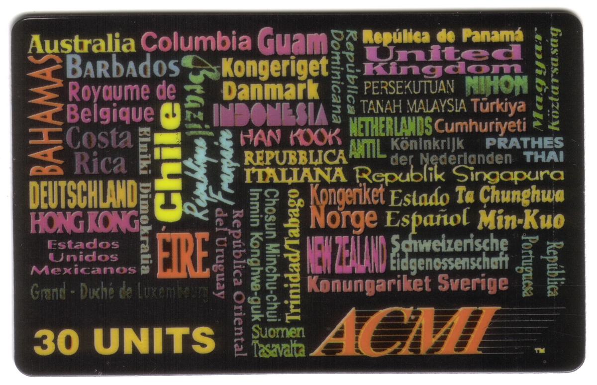 At the center of the card, the text "30u International Origination Card" is clearly printed, indicating the card's value or units. The letters "ACMI" appear on the lower right portion of the card, identifying the issuer. The color palette consists mostly of shades of blue, green, and red, giving the card a lively and colorful appearance. The design is clean, focused on the typographical country names with no additional images or logos interrupting the composition.
