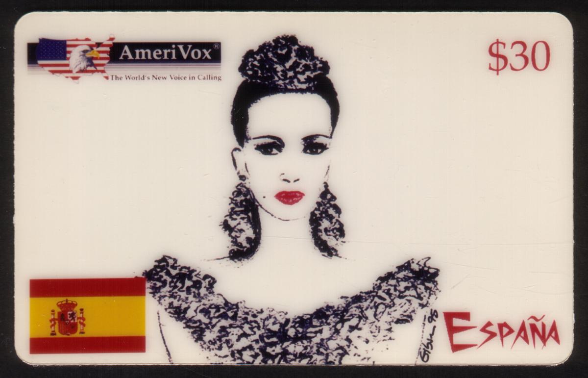 The card is valued at $30, shown clearly in red text in the upper right corner. The word "España" is prominently printed in red script toward the lower right side of the card, near the artist’s signature, "Clay A Gibson," which appears just above it. In the upper left corner, the AmeriVox logo is displayed, featuring an American flag and an eagle with the tagline "The World's New Voice in Calling."