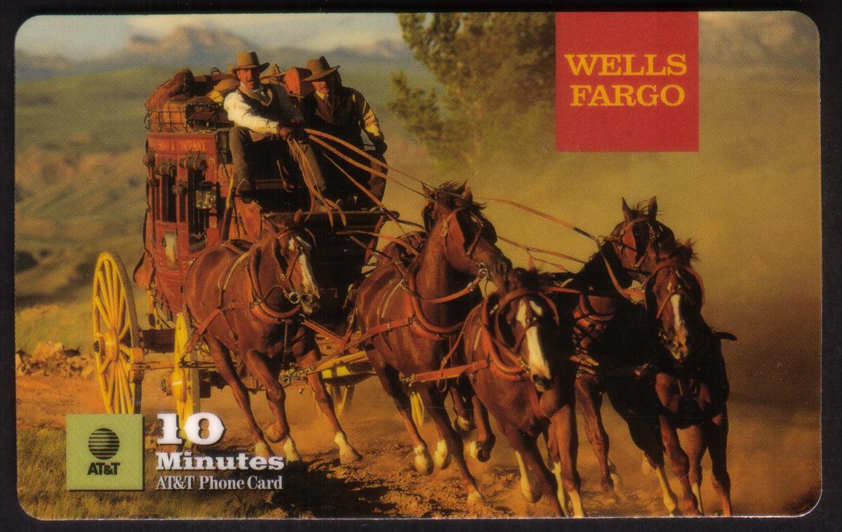 Overall, the card combines historical imagery with branding from both Wells Fargo and AT&T, making it a promotional phone card that highlights a classic symbol of American transportation and banking history.