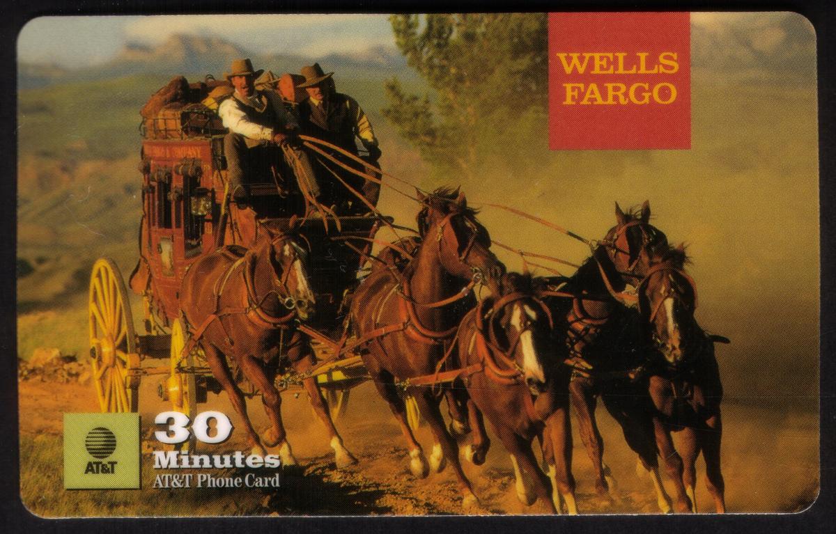 This banking card is clearly marked with a 30m value indicator, showing that it is related to a timed or recorded use, consistent with banking card purposes. The overall layout is clean, with emphasis on the horse-drawn stagecoach as the main visual element, clearly connecting the theme to Wells Fargo's historic brand imagery. The card’s design and markings align with a promotional banking item featuring corporate logos and a historical transportation theme.