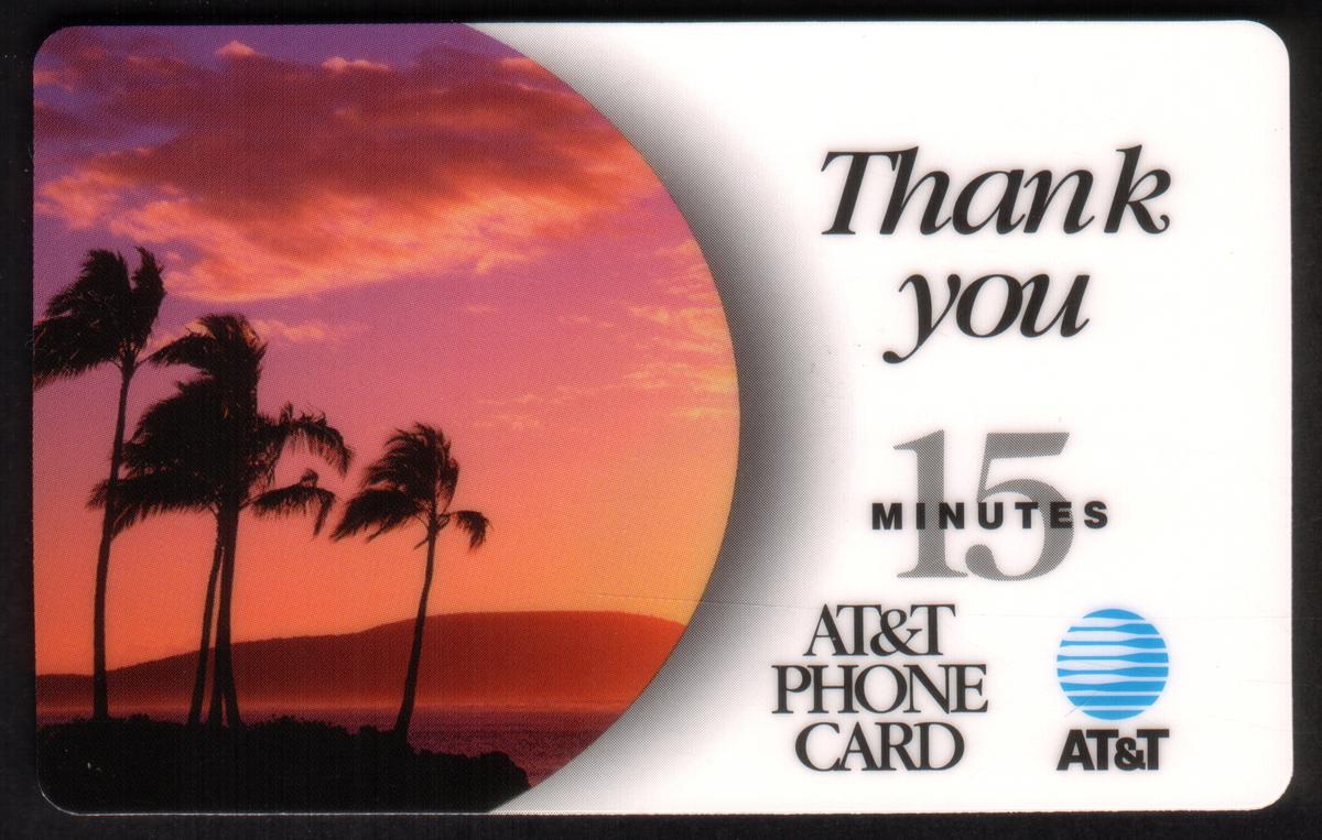 The card includes the AT&T logo, establishing it as an AT&T phone card specimen. The text “Thank you” is displayed on the card, emphasizing a theme of appreciation and thanks. The card’s face value is marked as 15m, indicating the minutes available for use. Overall, the design conveys a sense of gratitude combined with tropical and mountainous imagery.