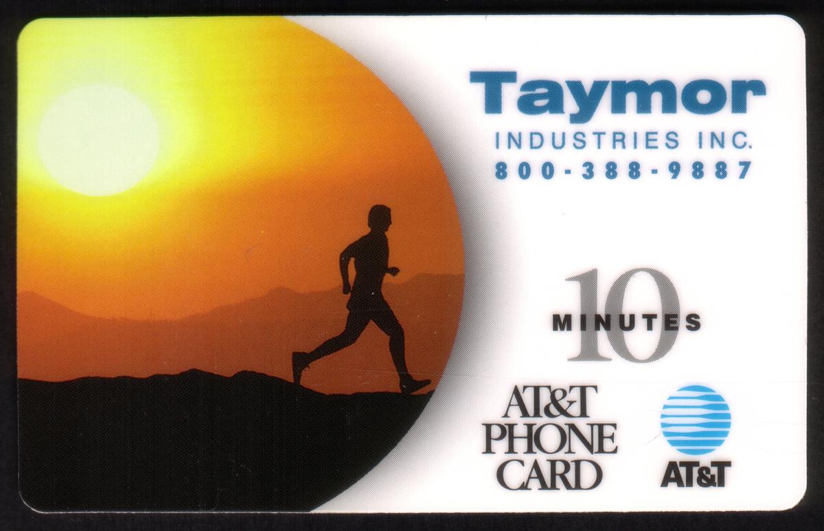 Overall, the card merges themes of business and exercise with decorative and builders hardware concepts, as suggested by the branding and keywords. The striking visual of running under a colorful sky creates an energetic and motivational vibe consistent with the "Running at Sunset" theme presented by Taymor Industries and AT&T.