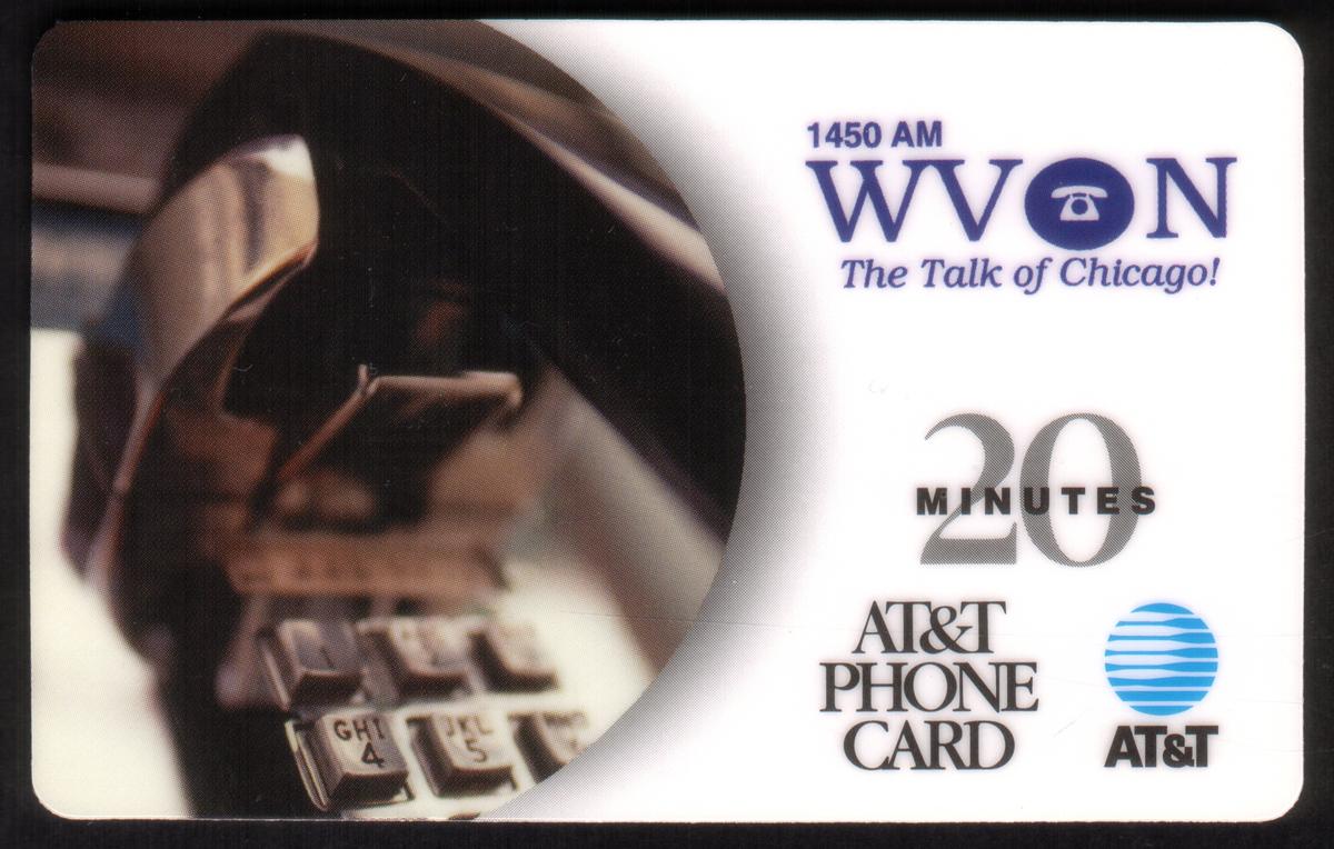 This collectible phone card features a design promoting WVON Radio 1450 AM, a well-known radio station in Chicago. The card showcases an image of a payphone keypad and handset, representing its connection to phone use and telecommunication. The text on the card includes "20m WVON Radio 1450 AM Chicago," identifying the location and broadcast frequency of the station. The phrase "Phones on Phonecards" is also present, emphasizing the card’s promotional theme related to phone use and phonecard collections.