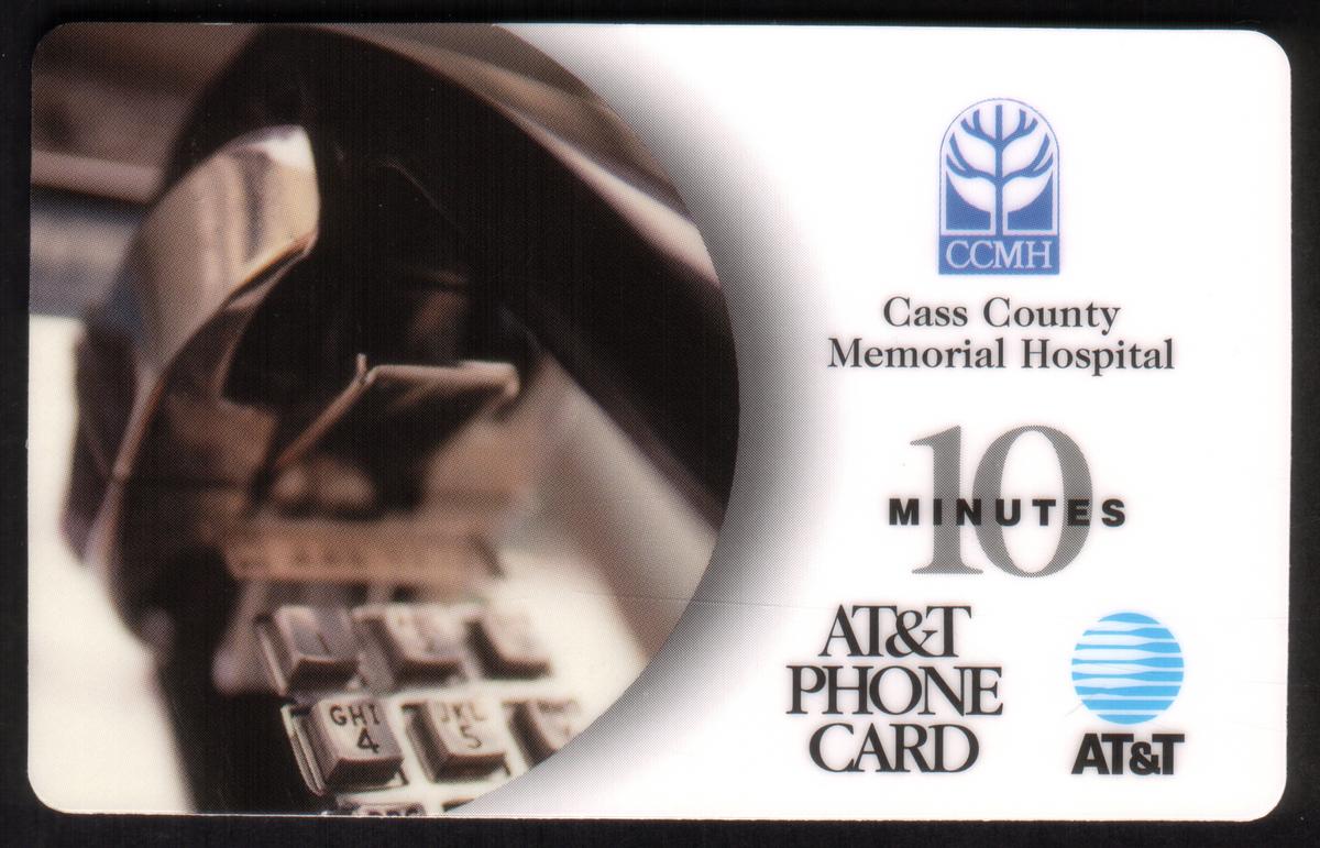 This collectible phone card features a detailed image of a payphone keypad and handset from Cass County Memorial Hospital (CCMH). The design highlights the functional components of the hospital’s payphone, including a close-up view of the numeric keypad and the attached handset, emphasizing the theme of medical facilities and communications. The card includes printed text identifying Cass County Memorial Hospital and CCMH, aligning with its promotional purpose.