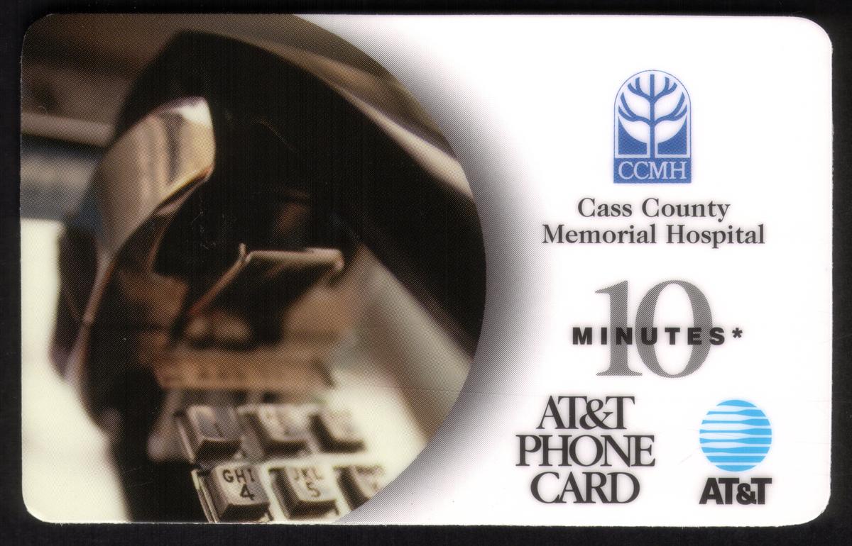 Overall, this phone card serves as a commemorative or promotional item highlighting Cass County Memorial Hospital’s payphone equipment, combining corporate branding and medical facility association in a functional calling card format.