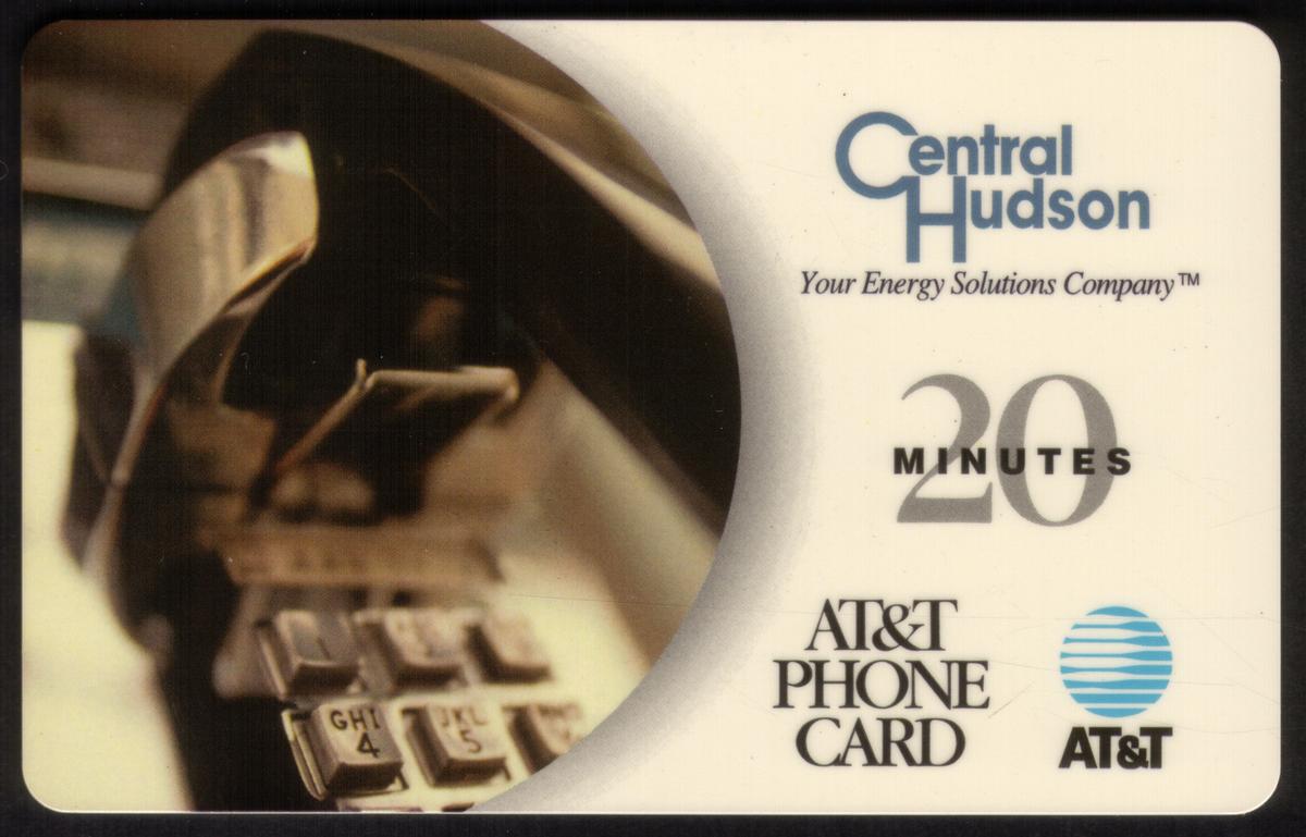 The overall composition effectively blends the phone’s close-up features with branding elements, using a clean and professional layout. The card serves both as a collectible item and as a promotional piece for Central Hudson and AT&T, combining corporate identity with phone card utility.