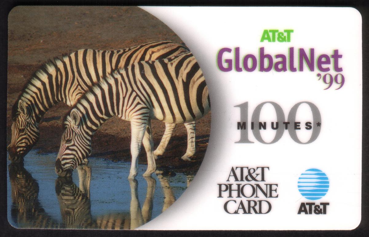 This promotional collectible phone card features two zebras standing side by side on the left side of the card. The card is labeled with "100m AT&T GlobalNet '99," indicating it was issued in 1999 with a 100-minute calling value for AT&T’s GlobalNet service. The AT&T logo is visible, confirming the card's issuing company.
