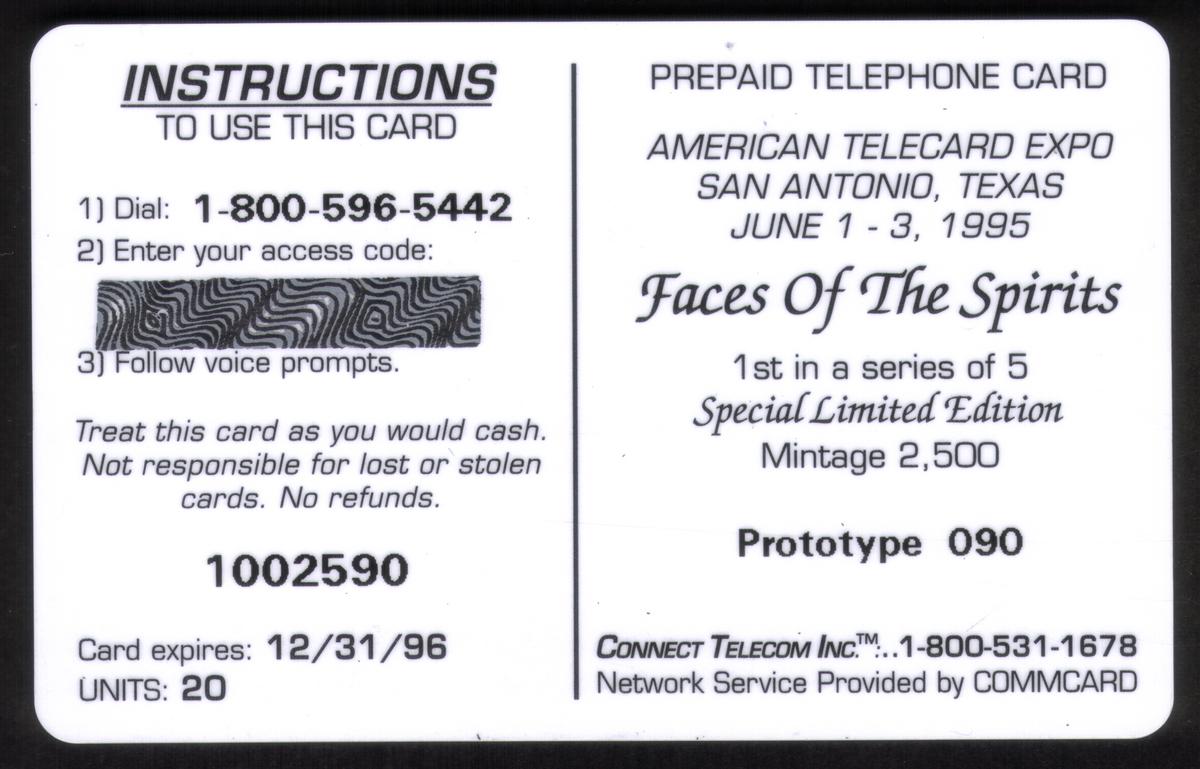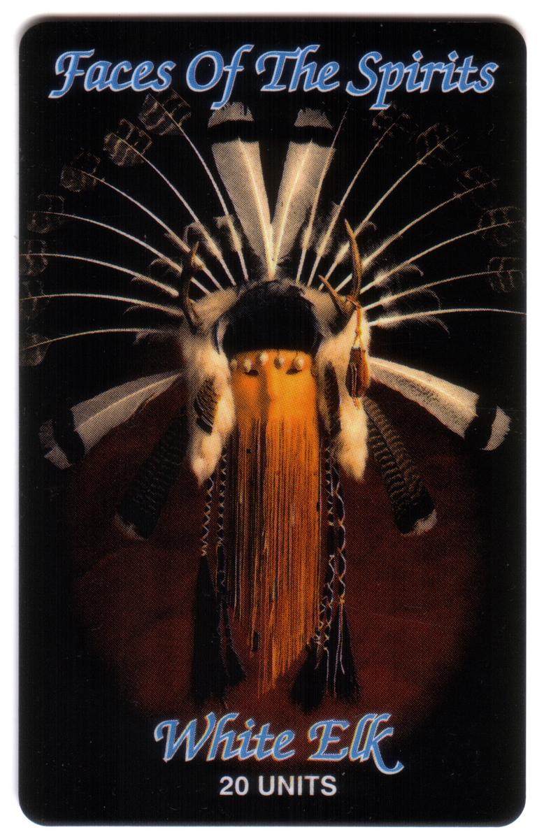 The card was issued for the Telecard Expo in San Antonio, Texas, in June 1995, as a prototype commcard for Connect Telecom Inc. It represents Native American heritage and culture, with a focus on the figure of White Elk.