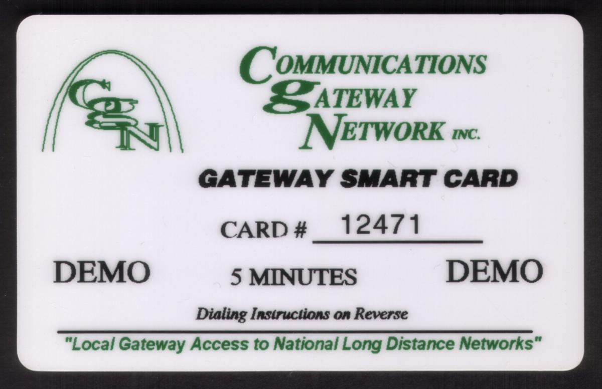 This collectible smart card features the text "Communications Gateway Network Inc." prominently at the top in green letters. Below, in bold black letters, it reads "GATEWAY SMART CARD." The card number is printed as "12471" in black, centered beneath the main title. On both the left and right sides of the card, the word "DEMO" appears in black uppercase letters.