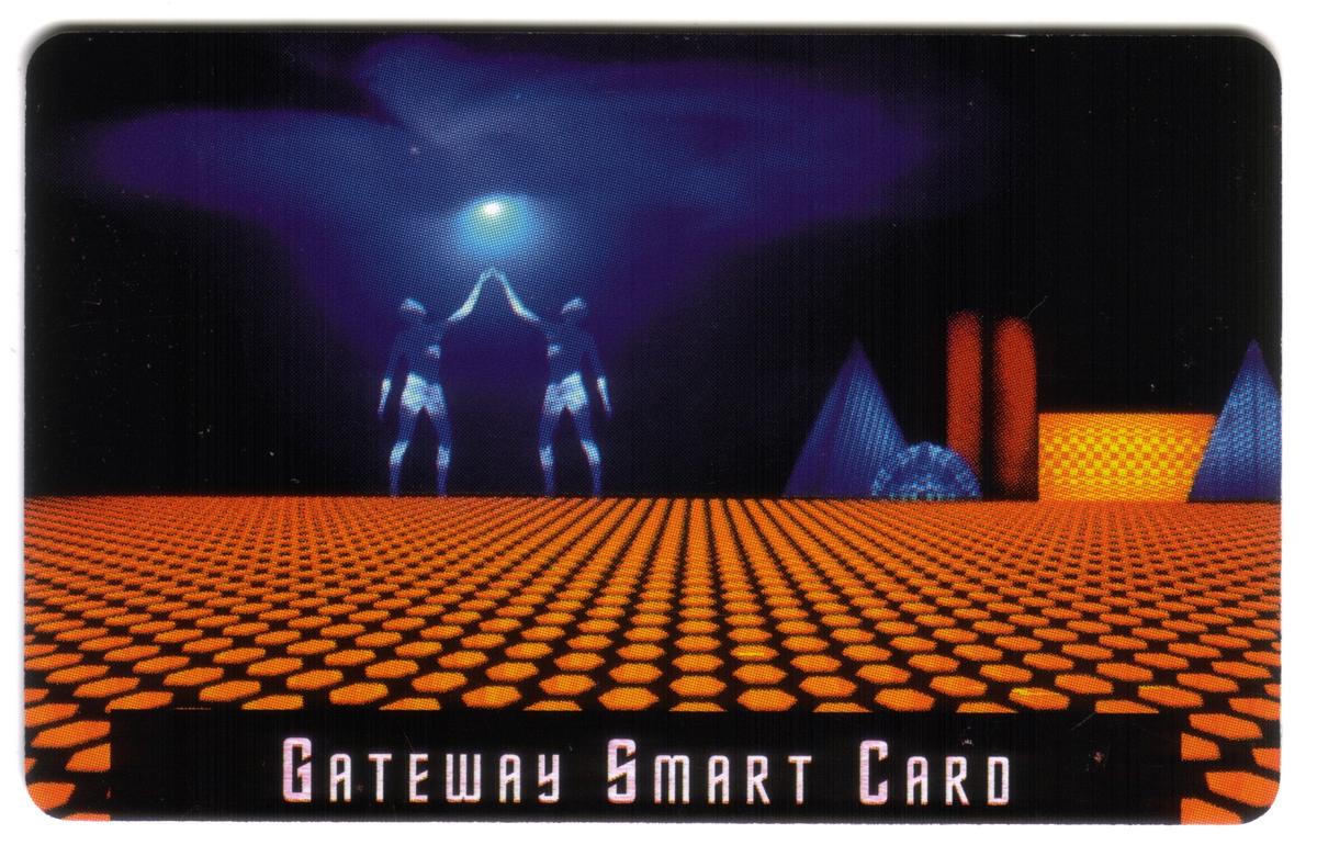 Above the scene, the text reads "20u Futurescape With Aliens," indicating the card’s value of 20 units. To the right side of the card, the phrase "Gateway Smart Card" is prominently displayed, referencing telecommunications technology. The lower left corner carries the "WorldCom Communications Gateway" logo, identifying the issuing entity. These textual elements integrate seamlessly with the visual theme of outer space and futuristic communication technology.