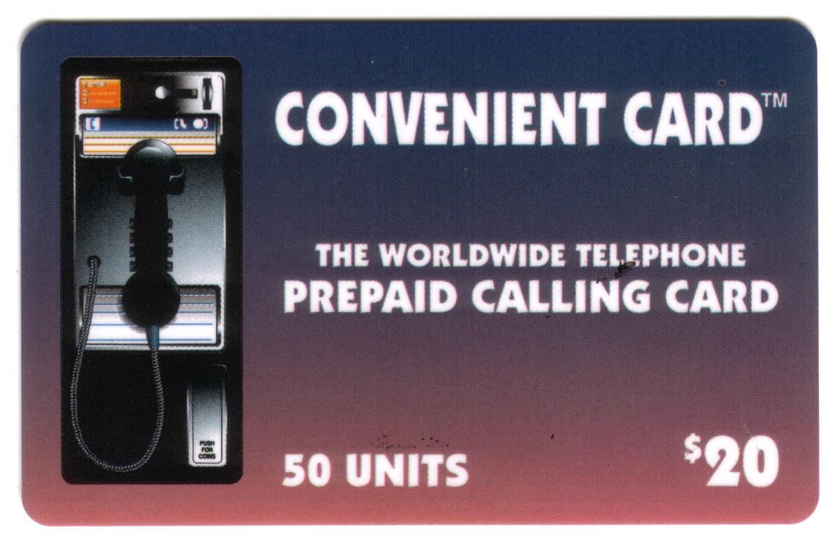At the top of the card, the text reads "Convenient Card," and below the payphone image, it states "Convenient Card, Inc." The card also includes the denomination "ldds $20," indicating a face value of 20 units. The layout is clean and simple, focusing on the image of the payphone with minimal extra design elements.