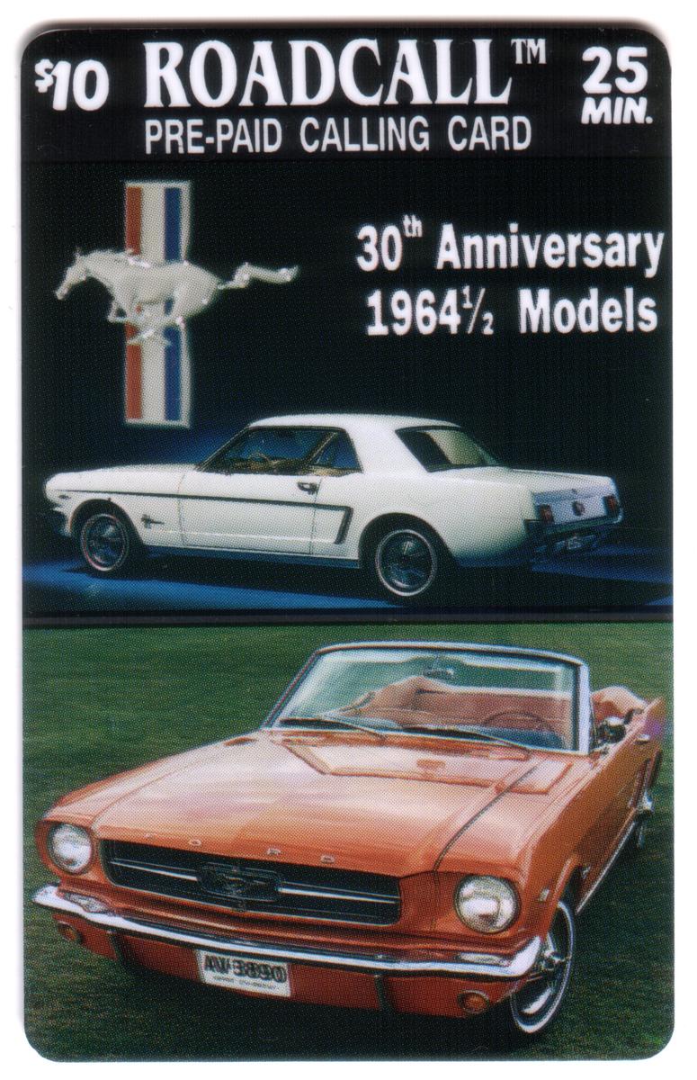 The card includes the text "RoadCall Ford Mustang Cars" and marks the 30th Anniversary of the 1964 1/2 Mustang models. The denomination of the card is indicated as $10. The bottom edge of the card shows the name "Convenient Card, Inc." as the issuer. This collectible card belongs to the automobiles and classic cars category, focusing specifically on transportation and the celebrated Ford Mustang line.