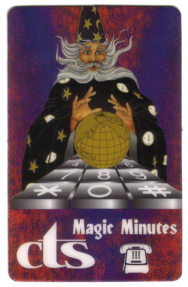 Above the wizard and globe image, the text "CTS Magic Minutes" is visible, identifying the issuing entity of the card. The overall design integrates elements of clocks and time, complementing the theme of magic and communication. The wizard’s presence alongside the crystal globe and keypad symbolizes an intersection of time, world connectivity, and magical power.