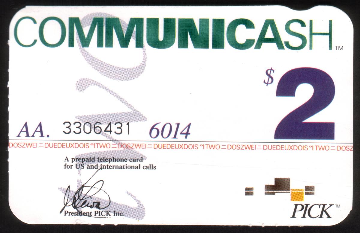 This card represents a piece of telecommunications and prepaid value card history from the mid-1990s, issued under the CommuniCash brand and officially authorized by Pick, Inc. Its paper format and printed President’s signature distinguish it as a collectible item related to the use and distribution of prepaid communication services during that period.