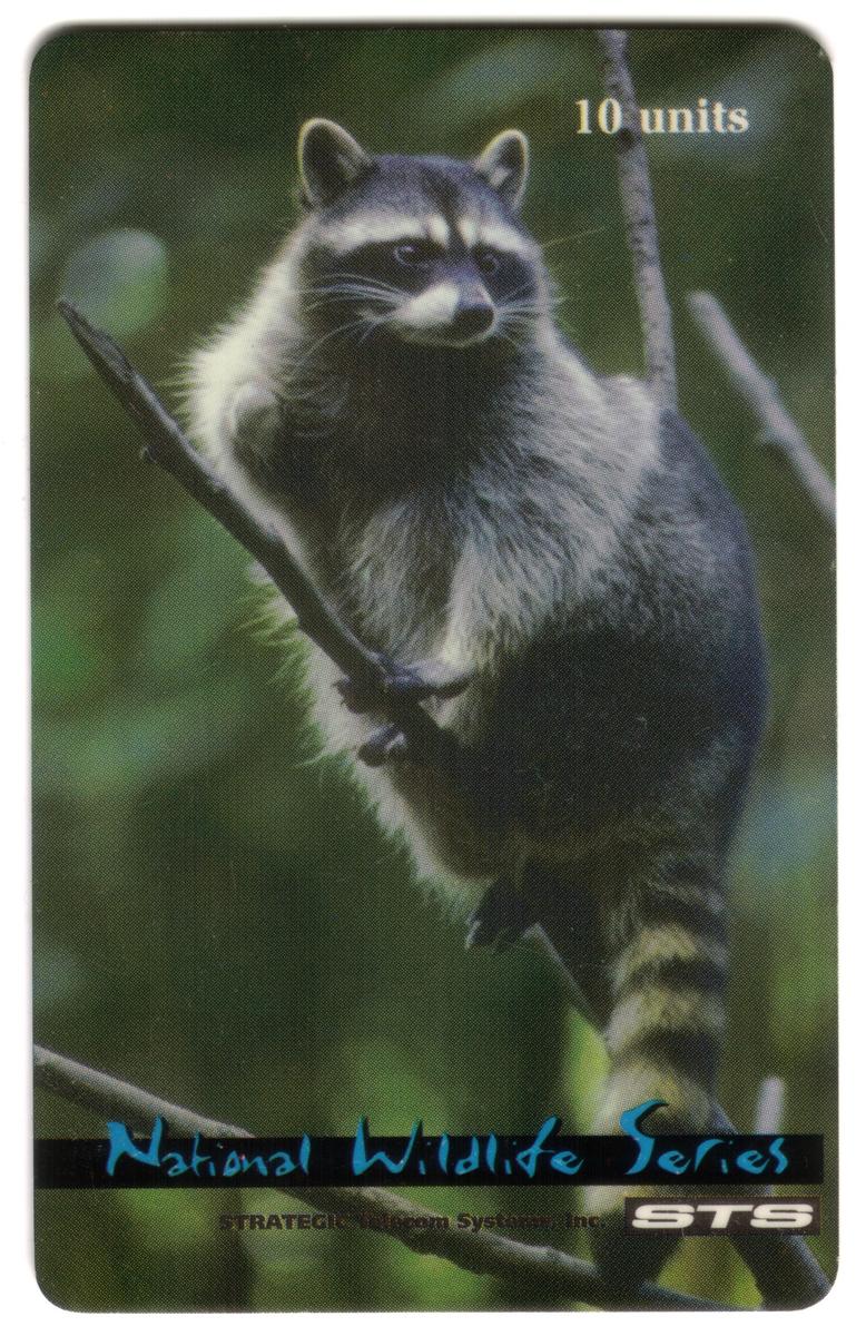 This collectible phone card features a detailed image of a raccoon set against a natural background, emphasizing wildlife themes. The raccoon is central to the design, and the card belongs to the National Wildlife Series, specifically focused on the raccoon. The card's design includes the logo of Strategic Telecom Systems, which is prominently displayed on the front.