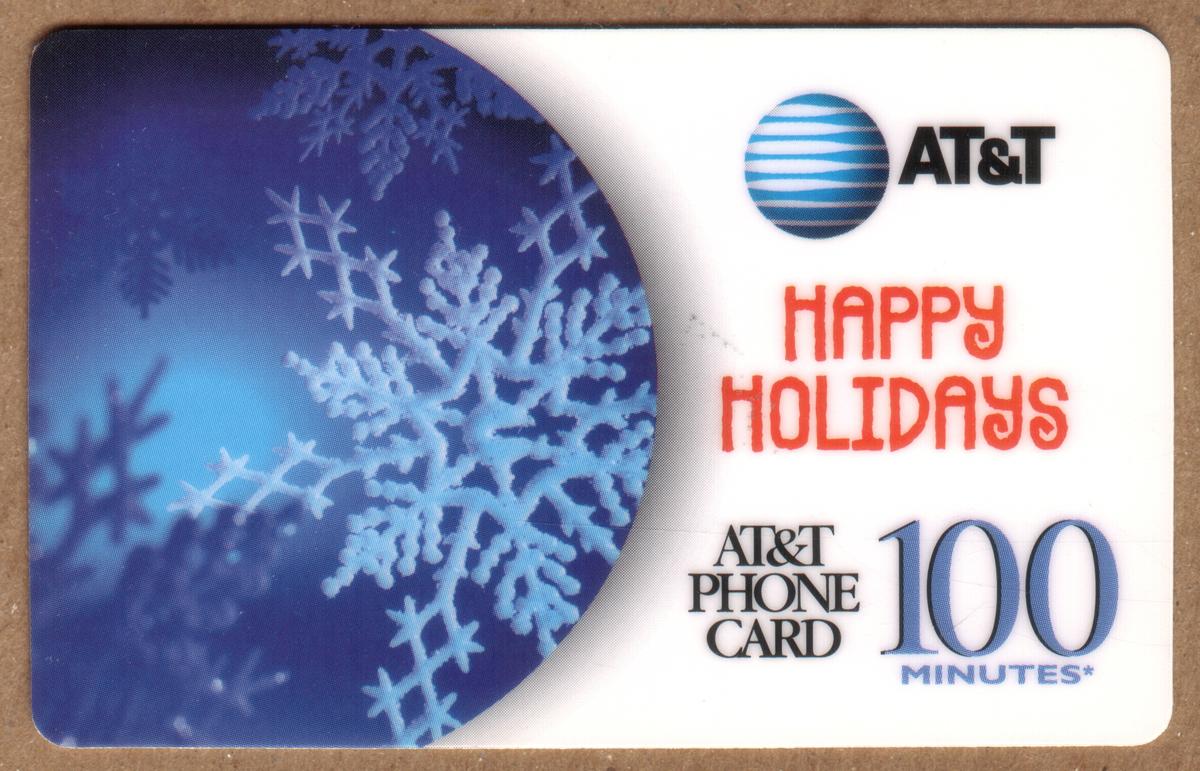 Overall, this promotional specimen phone card from AT&T is branded clearly and designed specifically for the holiday period, with clean typography and seasonal graphics focused on snowflakes and a blue color palette.