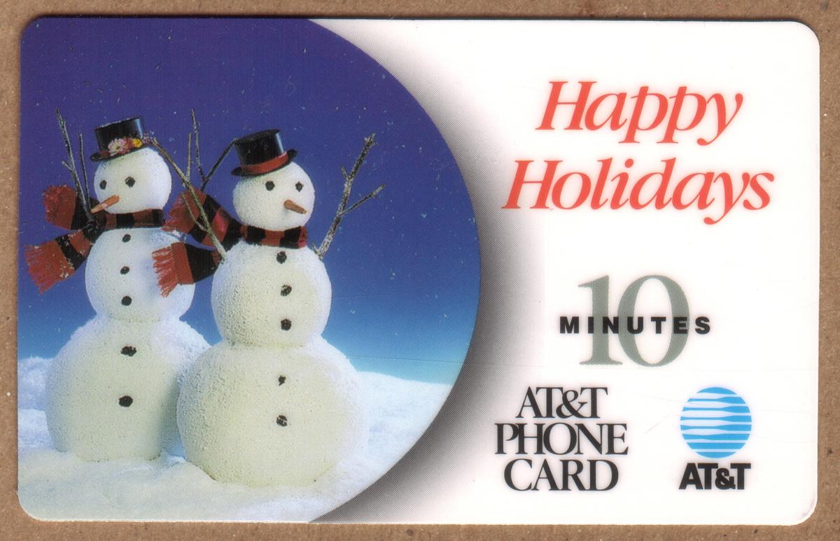 This card is identified as a promotional specimen phone card, named “Snowman 10m Happy Holidays (Two Snowmen In Half-Circle) SPECIMEN,” with a 10-minute usage value. It is produced by AT&T and clearly intended for use as a collectible item celebrating the holiday season.