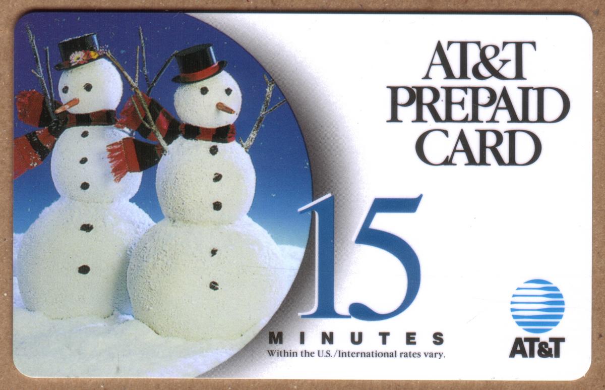 In the lower right corner, the official AT&T globe logo appears alongside the company name. This card is a stored memory smart card with a magnetic stripe, designed for use as a prepaid service card providing 15 minutes of calling time. The design reflects a promotional, collectible theme featuring the winter holiday motif of snowmen.