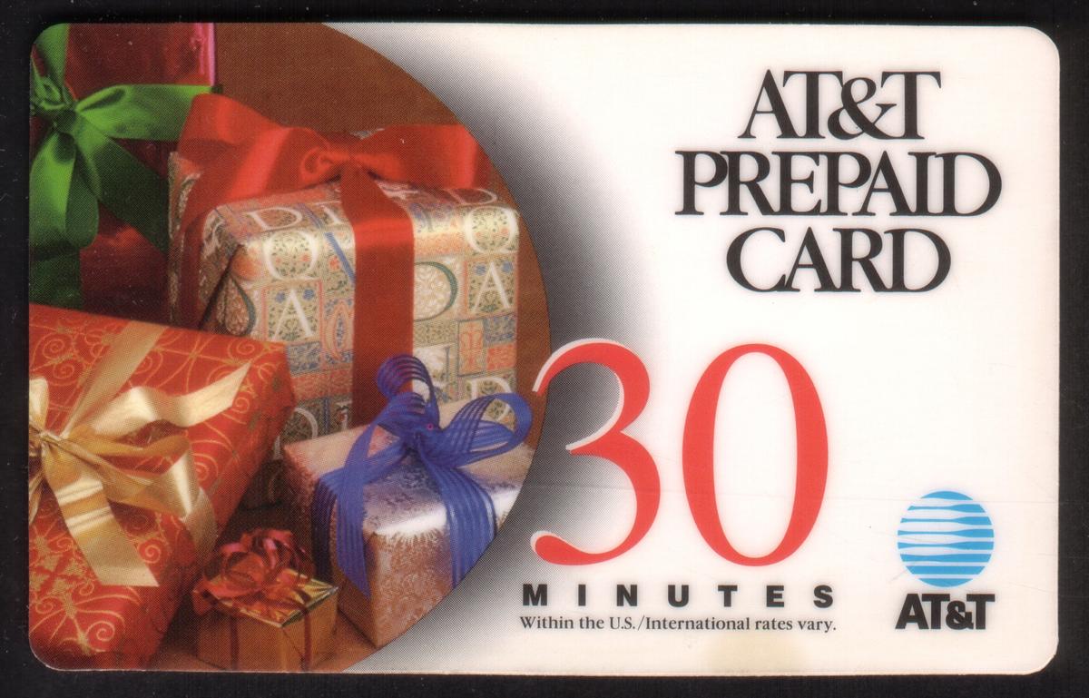In the upper left corner, the AT&T logo is clearly visible in its classic blue globe design paired with the “AT&T” text. Adjacent to the logo, the card indicates a value of 30 minutes, emphasizing its use for timed calling. The overall layout is clean and straightforward, with the text "promotional user card" appearing on the card, reinforcing its special edition status related to holiday use.