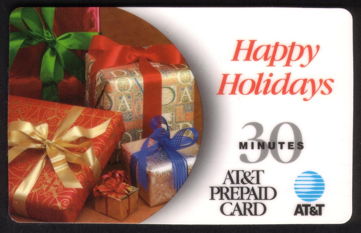 This promotional phone card is clearly designed for use during the holiday season, with a clear emphasis on gift-giving as seen in the semi-circle of wrapped gifts. The inclusion of the "Happy Holidays" greeting and the AT&T branding makes it a collectible item associated with the company’s seasonal offerings.
