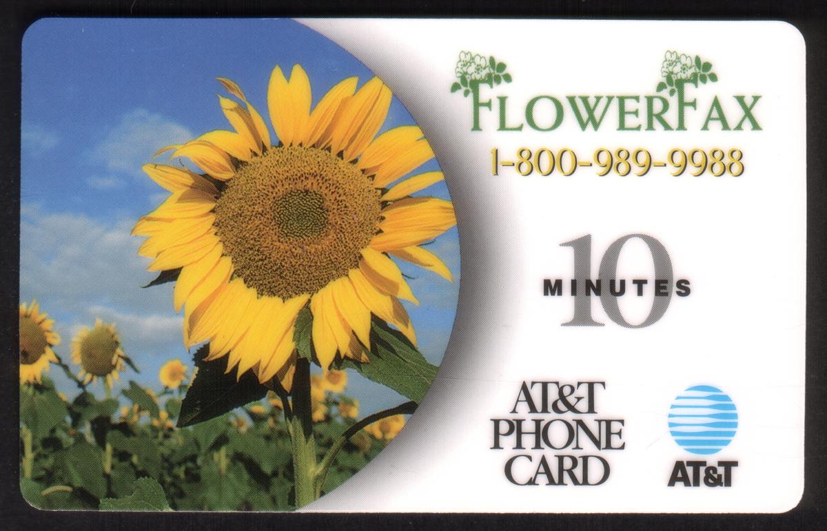 This collectible phone card features a large sunflower as its central image. The sunflower is presented in bright yellow hues with detailed petals and a dark central disk. The card includes the text "Flowerfax 10m Flower Fax 1-800-989-9988" prominently displayed in white font at the top left corner against a green background. The AT&T logo appears in the lower right corner of the card, confirming the issuing company.