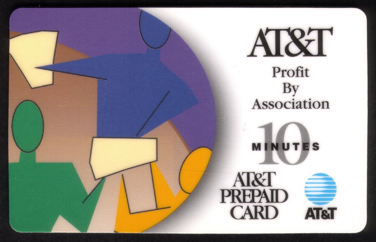 The card’s overall background color is black, which creates a strong contrast with the vibrant modern art elements and the white and blue text markings. It reflects a stylish and corporate promotional phone card issued by AT&T.