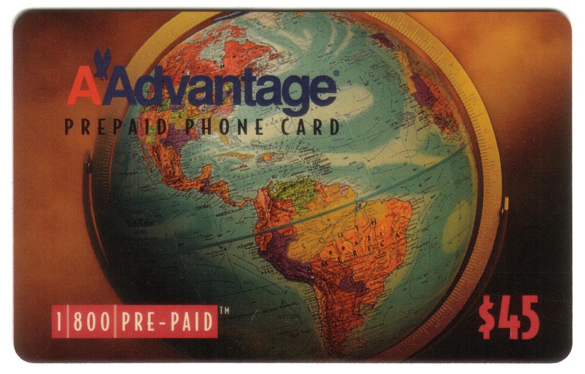 The card is branded with the American Airlines "AAdvantage" logo in the top left corner, combining the airline's red and blue colors. Below this, "PREPAID PHONE CARD" is printed in black capital letters. Along the bottom left edge, the text "1 800 PRE-PAID" appears in white on a red background. On the right side of the card, the denomination "$45" is displayed in bold red text.