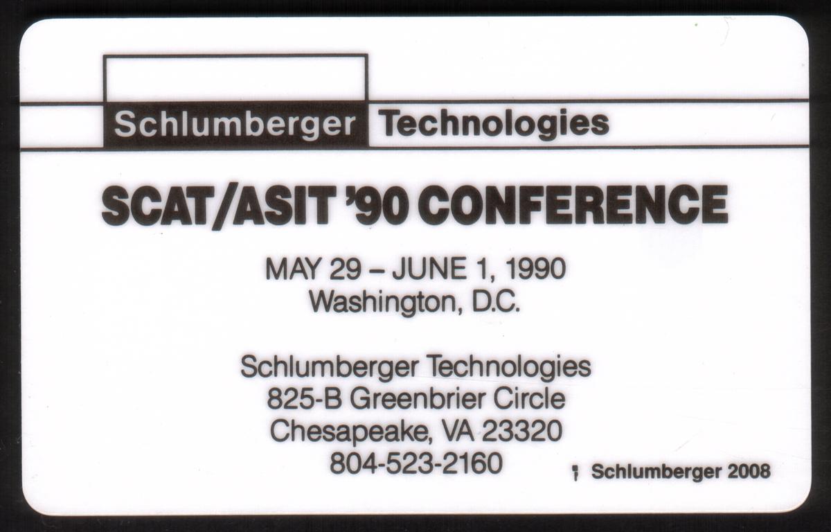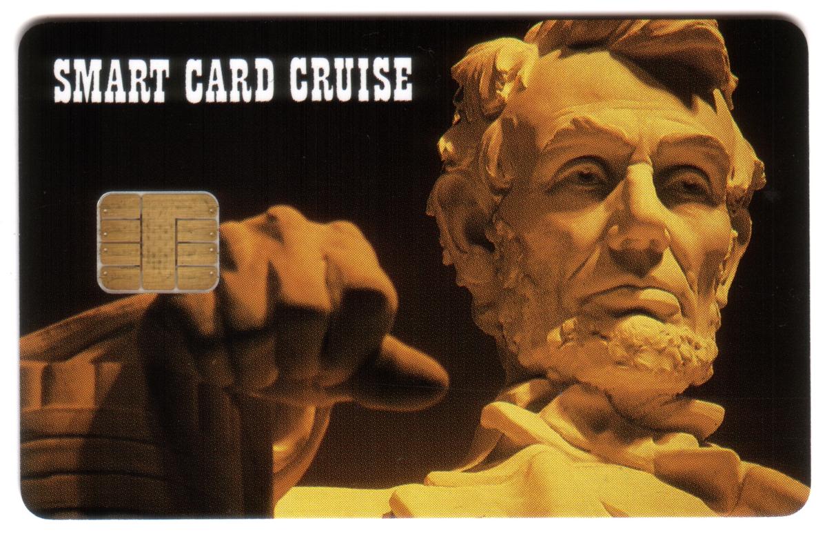 This smart card is associated with the 1990 Conference held in Washington, DC, related to the SCAT ASIT Conference and the Gold S14 chip. It is connected to Abraham Lincoln with a focus on the inverted L chip, and linked to Schlumberger and Comsat organizations. The card is part of a set and holds collectible value for those interested in historic or presidential-themed stored value cards.