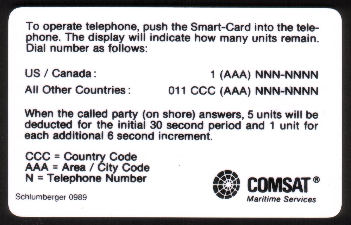 This card is a smart phone card used for maritime communication, under COMSAT's Ship to Shore service. The design elements including the world globe, satellite lines, ships, and telephones correlate with the keywords: world globe, satellite, telephones, chip card, ships, stored value, smart card, ocean, chip sc-4 gold 100u, and Ship to Shore service by COMSAT Mobile Communications.