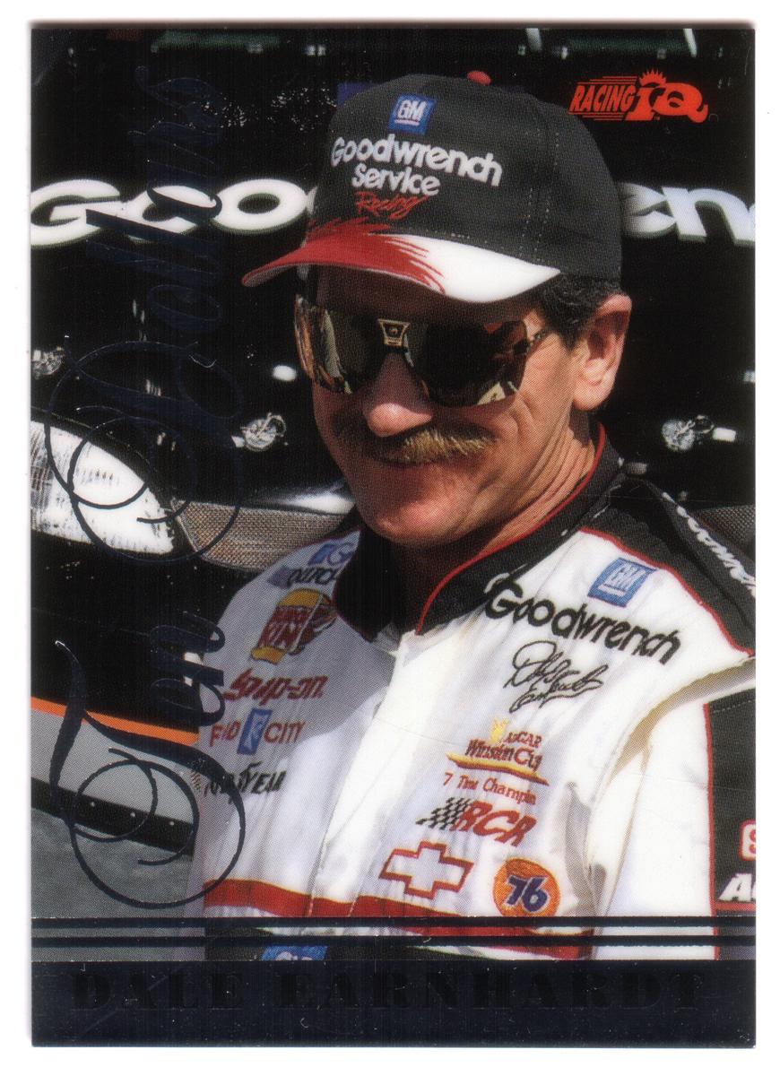 His signature is printed in black ink across the card, overlapping part of his image. The card background includes additional sponsor branding and racing-related graphics in black. The top right corner of the card features the "Racing" logo in red. At the bottom of the card, "DALE EARNHARDT" is printed in bold black letters across a transparent band.