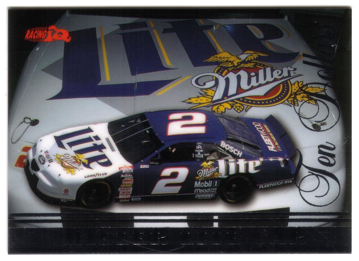 This card is identified as Racing IQ: Miller Lite Car (Sports Card Size) (Card #2 of 10) from The Score Board series (FRO). It is a collectible item within the auto racing sports category, specifically highlighting the iconic No. 2 Miller Lite race car associated with Rusty Wallace. The card measures in a size typical for sports cards.
