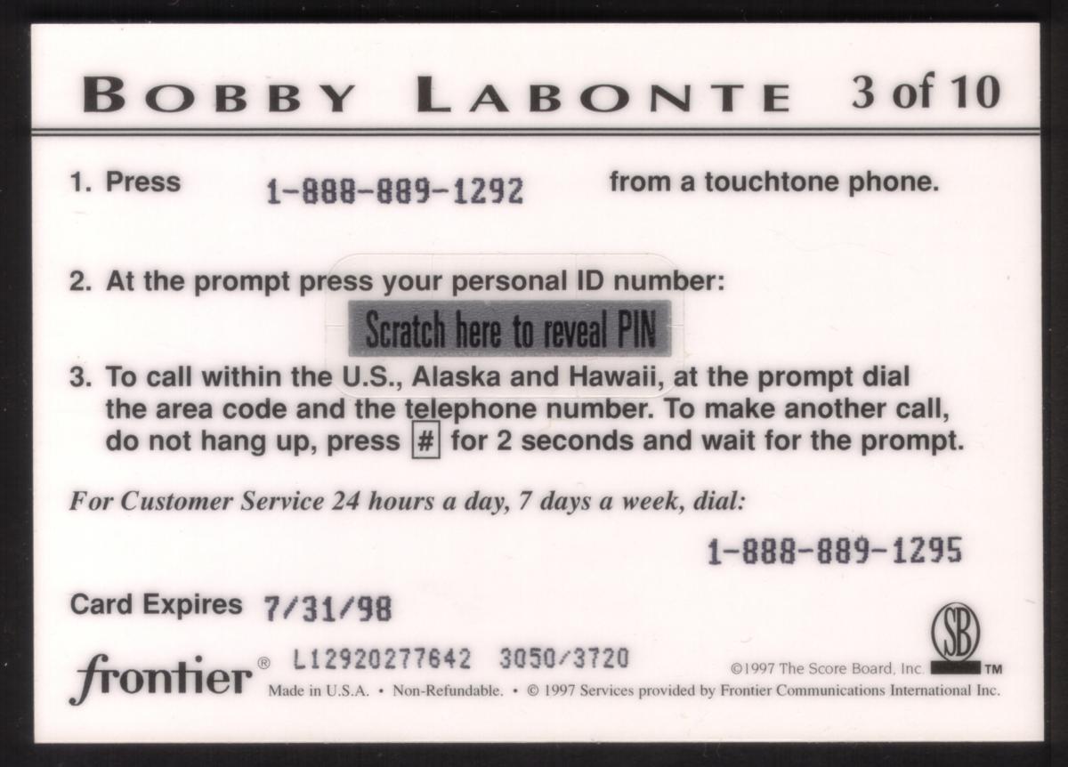 In the top right corner of the card, the "Racing IQ" logo is displayed in red and black. Along the left side of the card, "Bobby Labonte" is written vertically in a stylized black script font. The overall card size is sports card dimension. This card is number 3 in a series of 10 from The Score Board (FRO) collection and is valued at $10, as indicated by the details on the surviving front image.