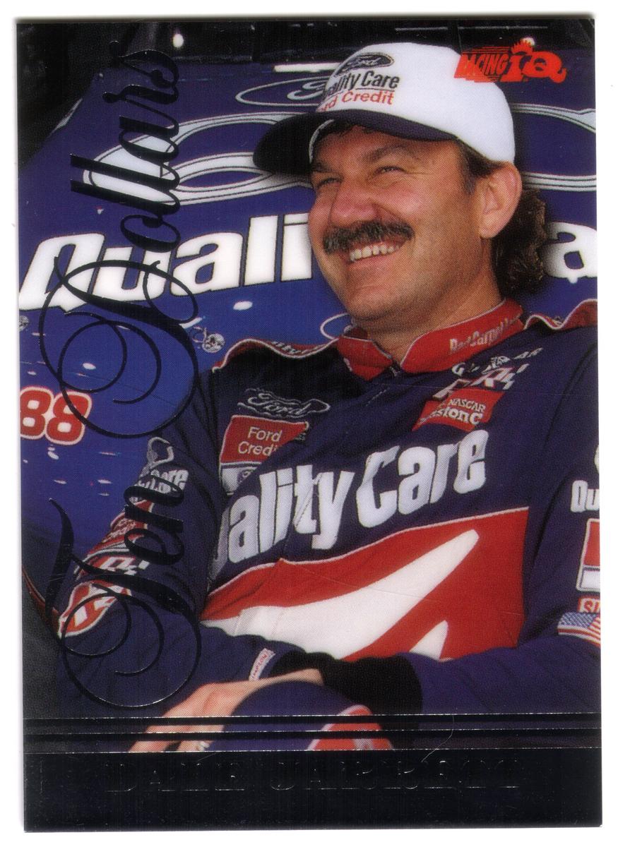 This collectible racing card features a color photographic portrait of Dale Jarrett, a notable NASCAR driver. He is shown smiling, dressed in his racing suit and white cap, both prominently branded with "Quality Care" and "Ford Credit." The dark blue suit also displays logos such as NASCAR Winston Cup and other sponsor patches, indicating his professional racing affiliations.