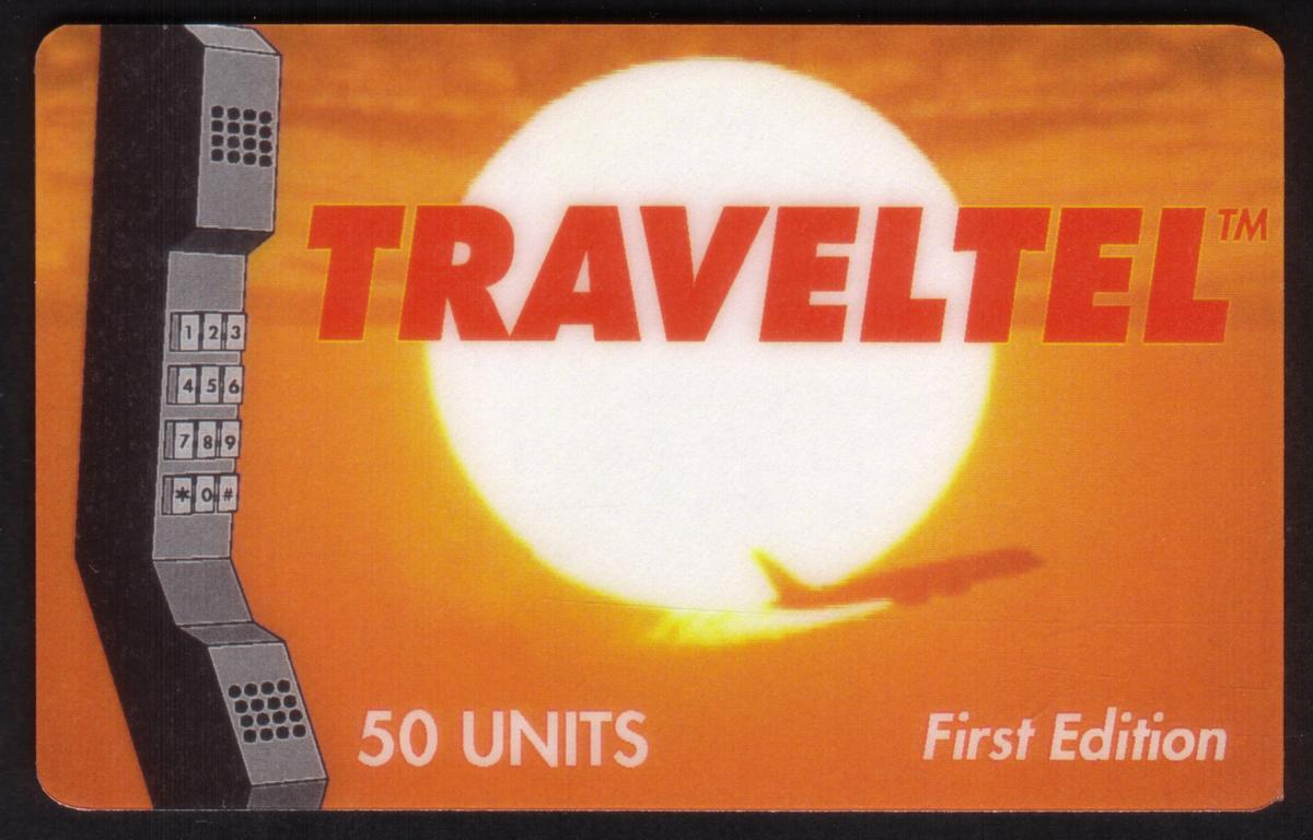 The card's theme combines elements of travel and telecommunications, as evidenced by the depiction of the airplane and the telephone receiver. Additional text on the card names "TravelTel Phone Cards" along the bottom edge. The value of the card is indicated as "50u," referring to its prepaid unit value for telephone usage.