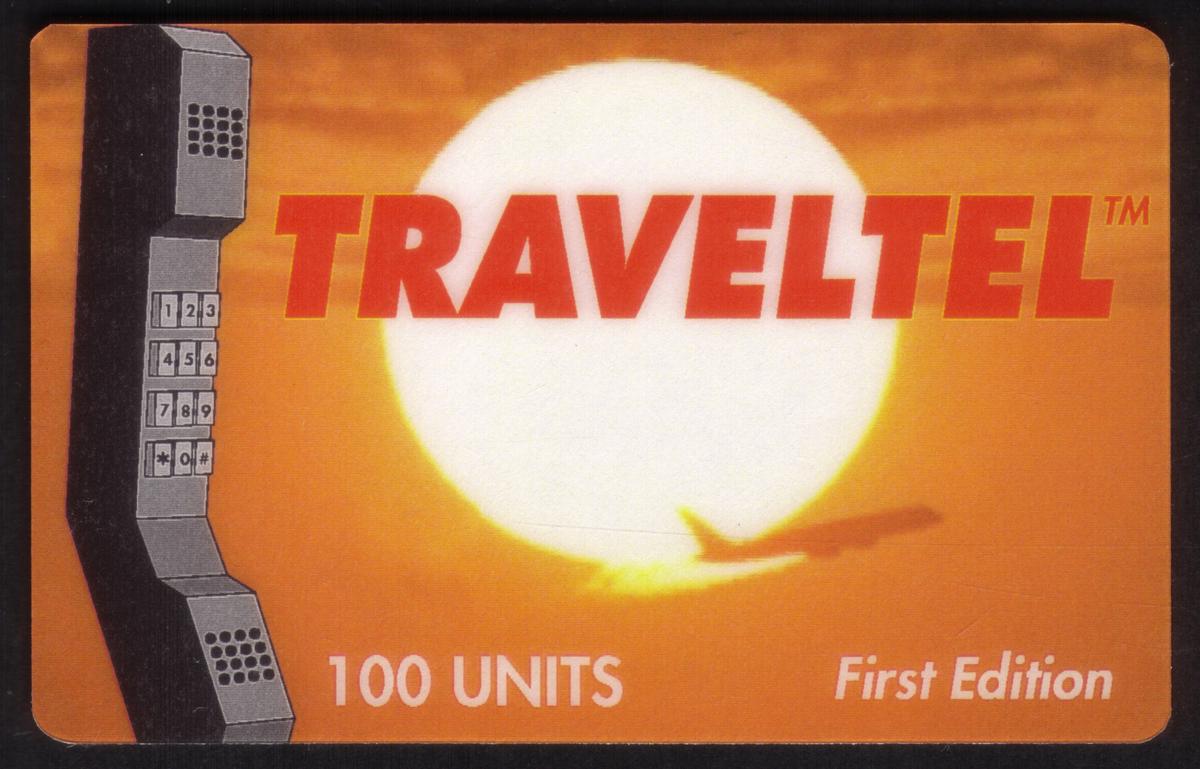 The phone card clearly highlights themes of travel and communication, combining the airplane graphic with the phone receiver to symbolize global connectivity. The card carries the branding of TravelTel and is designated as a "First Edition" with a unit value of 100.