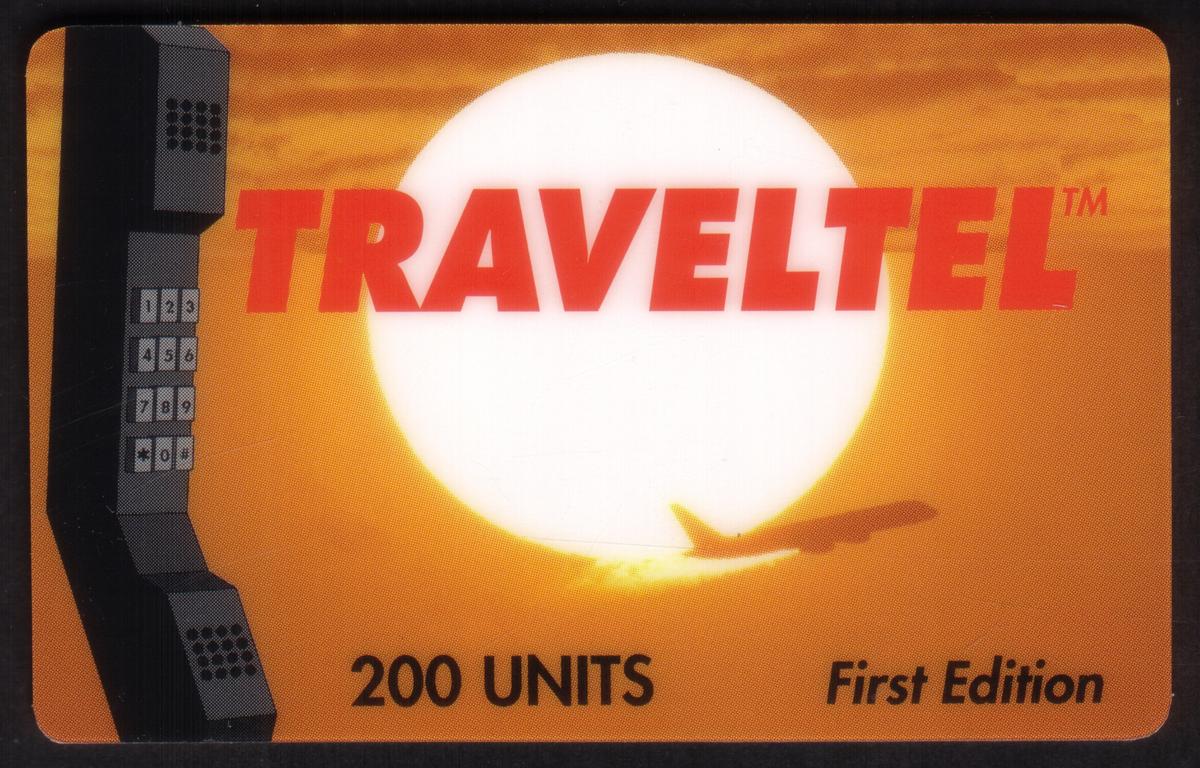This promotional collectible phone card from TravelTel represents phone usage units with a striking travel motif, combining imagery of air travel and telecommunications. It is designed for use as a travel-related phone card, featuring black lettering and thematic visuals centered on a phone receiver and airplane.