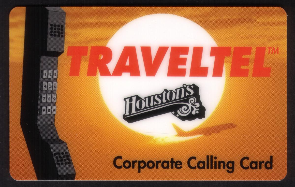 The card's design harmonizes elements of travel and dining, connecting the Houston’s Restaurant brand with TravelTel’s calling card service. The handset, sun, and airplane visually emphasize communication and travel, matching the promotional intent of this 10-unit corporate calling card.
