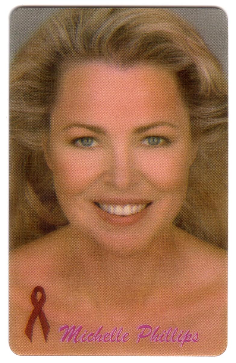 This collectible phone card features Michelle Phillips, renowned for her work as an actress and singer, prominently depicted in a portrait style image. The card is part of a charitable initiative benefiting Camp Heartland, a program dedicated to supporting children living with HIV/AIDS. The design includes text referencing the cause "To Benefit Children With HIV/AIDS" and highlights the association with COMINEX.