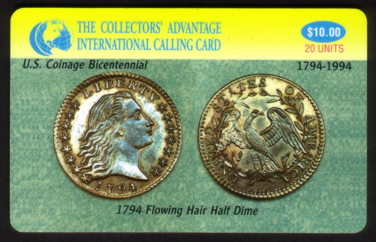 Overall, this collectible phone card commemorates the U.S. 1794 Flowing Hair Half Dime and is part of a series related to U.S. coinage bicentennial collectibles. The design highlights numismatic history with clear references to early U.S. currency, tailored for coin collecting and numismatic enthusiasts.