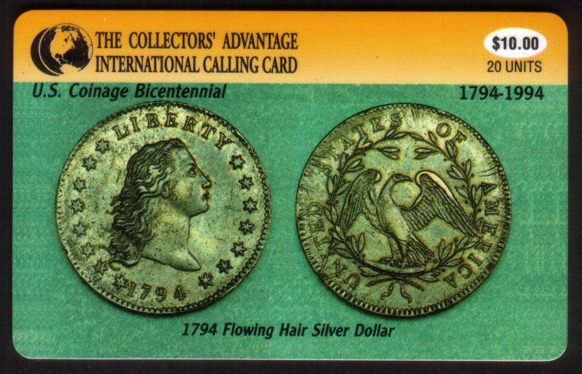 Keywords connected to this collectible include collectibles, coin collecting, silver coins, numismatics, money, monies, currency, currencies, silver dollars, and U.S. coinage Bicentennial. The card highlights the cultural and monetary significance of the 1794 Flowing Hair Silver Dollar and serves as a collectible tribute to this important artifact in American monetary history.